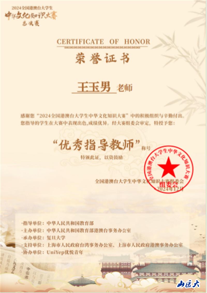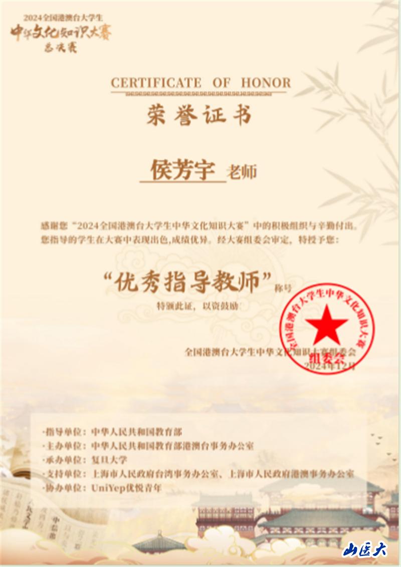 12月8日,全国港澳台大学生中华文化知识大赛落下帷幕。我校首次组织学生代表队参赛并获得最佳组织奖,侯芳宇和王玉男获优秀指导教师奖。