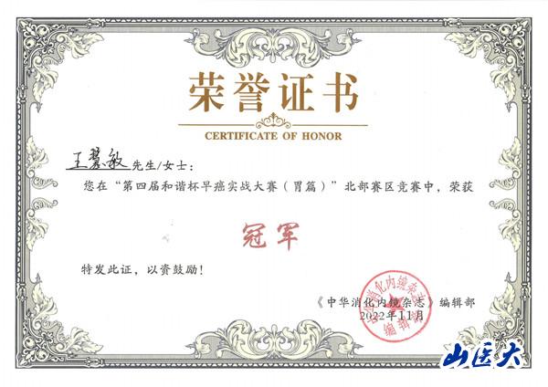 近日,在由北京友谊消化疾病诊疗技术创新战略联盟、中华医学会消化内镜学分会继续教育协作组、《中华消化内镜杂志》主办的第四届“和谐杯”早癌实战大赛(胃篇)北部赛区竞赛中,我校第二医院消化内镜室王慧敏主治医师从12名决赛选手的激烈角逐中脱颖而出获得冠军,并成功入围全国总决赛。