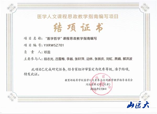 近日,教育部高等学校医学人文素养与全科医学教学指导委员会公布了“医学人文课程思政教学指南编写”项目结项审核结果,我校人文社会科学学院邓蕊教授主持、医学教育研究中心主任段志光教授等参与、联合北京协和医学院张新庆教授、南京医科大学刘虹教授、河北医科大学边林教授等知名专家共同完成的《“医学哲学”课程思政教学指南编写》课题被专家组评审为“优秀”等级。