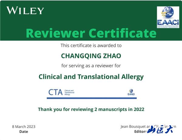 欧洲变态反应与临床免疫学会官方会刊《临床与转化变态反应杂志》给赵长青教授课题组发来的审稿“证书”