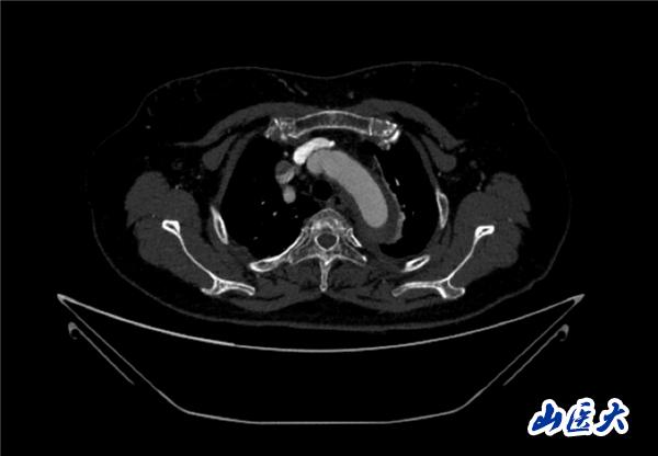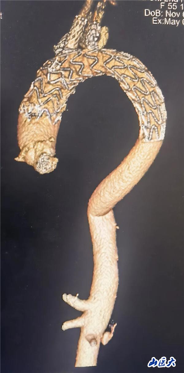 首例患者是一位55岁的女性,她患有高血压约2年时间,平时也会规律服用多种降压药,但血压控制始终不尽人意。2023年4月下午,她出现不明原因的头痛,在家拔罐缓解少许便未到医院就医,次日凌晨突感胸闷、胸背疼痛伴有呼吸困难等症状、家人急忙拨打了120,把患者送入医院急诊科进行救治,医生在急诊科行胸腹主动脉CTA时,显示主动脉弓部-降主动脉及腹主动脉壁间血肿,遂收治入医院血管外科,患者入院10天后复查血肿仍未有改善,依然伴有胸背部疼痛等不适,如不进一步处理,可能发展为夹层危及生命,患者及家属经过与医生团队了解沟通,决定进行创伤小、恢复快的介入手术治疗。张玮教授、符伟国教授、董红霖教授及其血管外科团队(闫盛、常文凯、田琴琴)共同商讨手术方案,最终确定使用Zipper™一体式主动脉弓覆膜支架系统,行胸主动脉覆膜支架腔内隔绝术+无名动脉、左颈总动脉、左锁骨下动脉分支重建术为患者进行治疗。董红霖教授及其血管外科团队根据患者术前头颅CT平扫提示双侧侧脑室旁缺血灶,血压控制不稳定,属夹层壁间血肿非典型夹层等风险点,制定了完整的手术方案,术中经股动脉置入Zipper支架主体,经预留导丝超选无名动脉,并确保主体支架对位准确,顺利置入左颈总动脉、左锁骨下动脉支架,重建弓上三分支。手术过程非常顺利。术后观察主动脉及分支覆膜支架定位准确;无内漏;分支支架通畅,动脉供血正常。